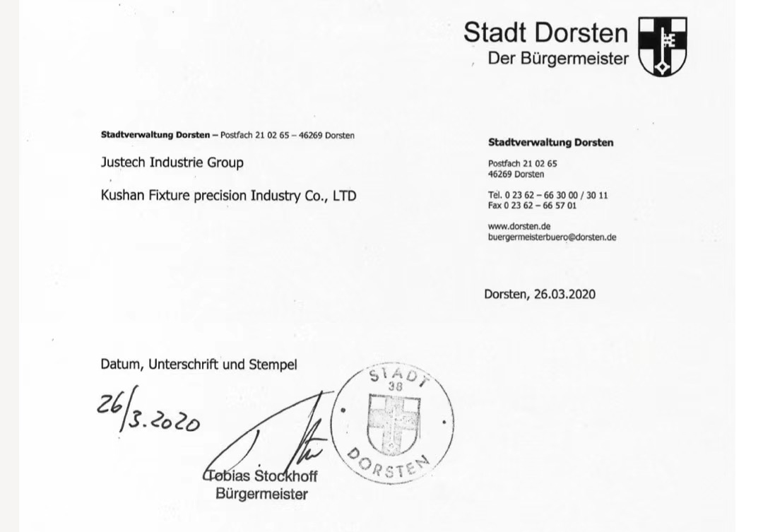 2020年3月26日,德国Dorsten市市长致信江苏杰士德集团旗下菲克驰精密制造有限公司总经理Frank, 对菲克驰在疫情期间捐助的防疫物资表示诚挚的感谢,也对江苏杰士德集团全体员工以及友好的中国人民表 ...