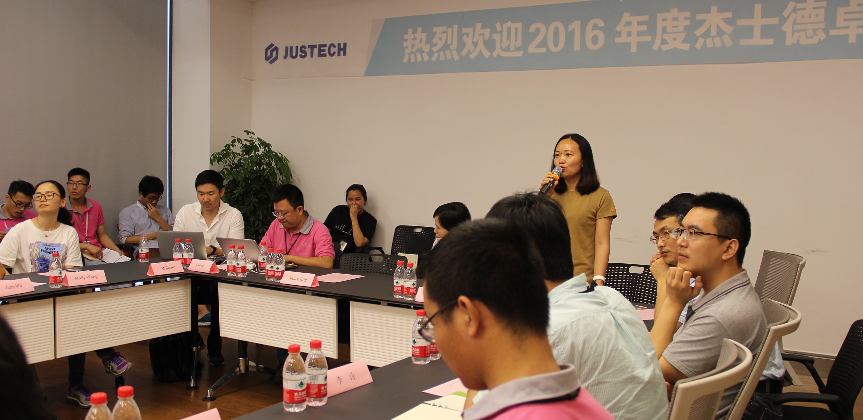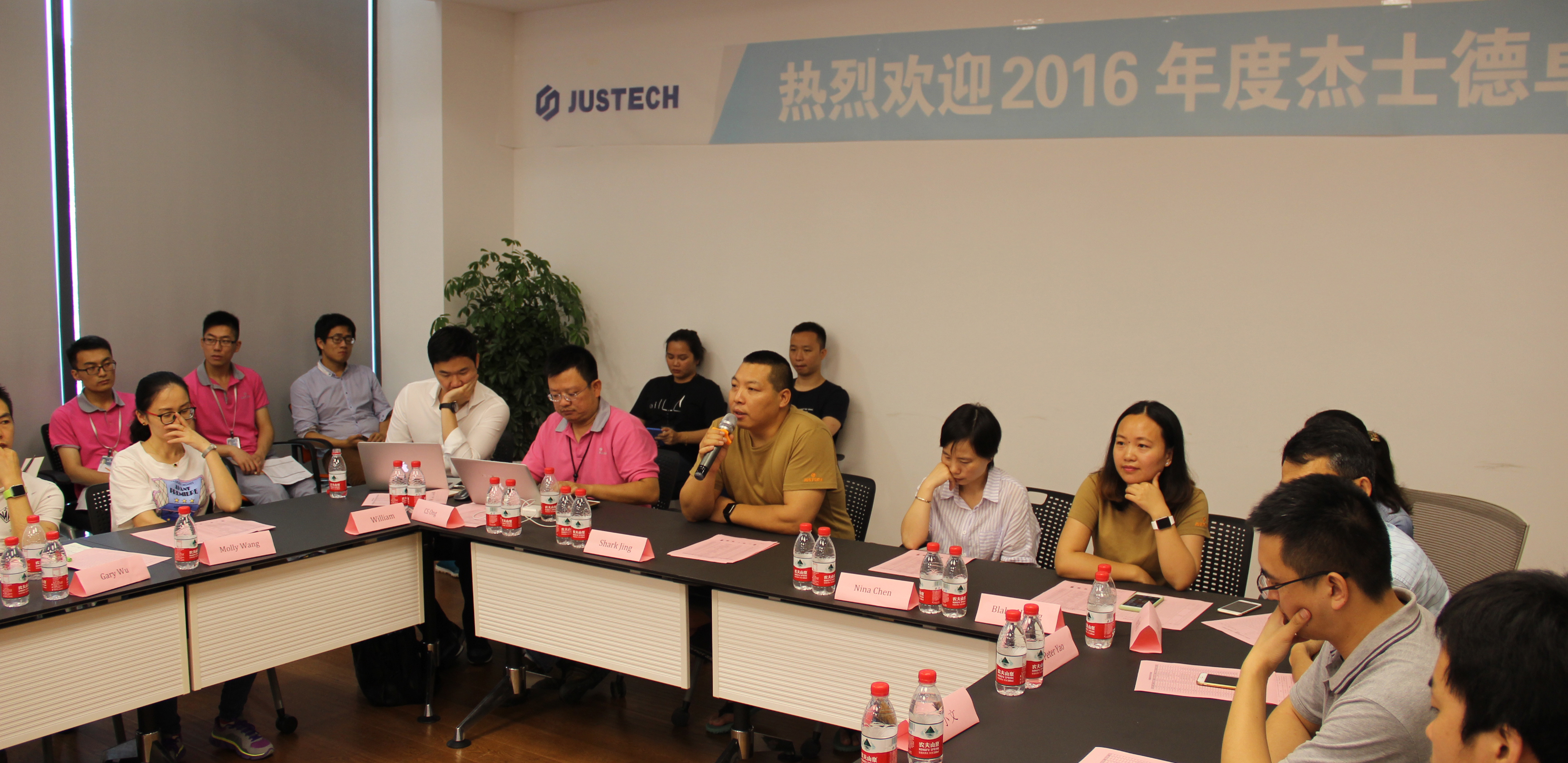 会中,我杰士德高大威猛的老板Shark也来与小伙伴们见面,欢迎大家加入JUSTECH,详细询问大家在住宿、吃饭等生活方面是否有困难。之后就“大学生进入职场、融入社会”等话题进行了分享,告诉学员们要“断奶”,学会自立自强。还谈到了学校教育和实际工作中的不同,鼓励大家学习。最后还幽默地回答了大家的提问,让大家感觉受益匪浅。
