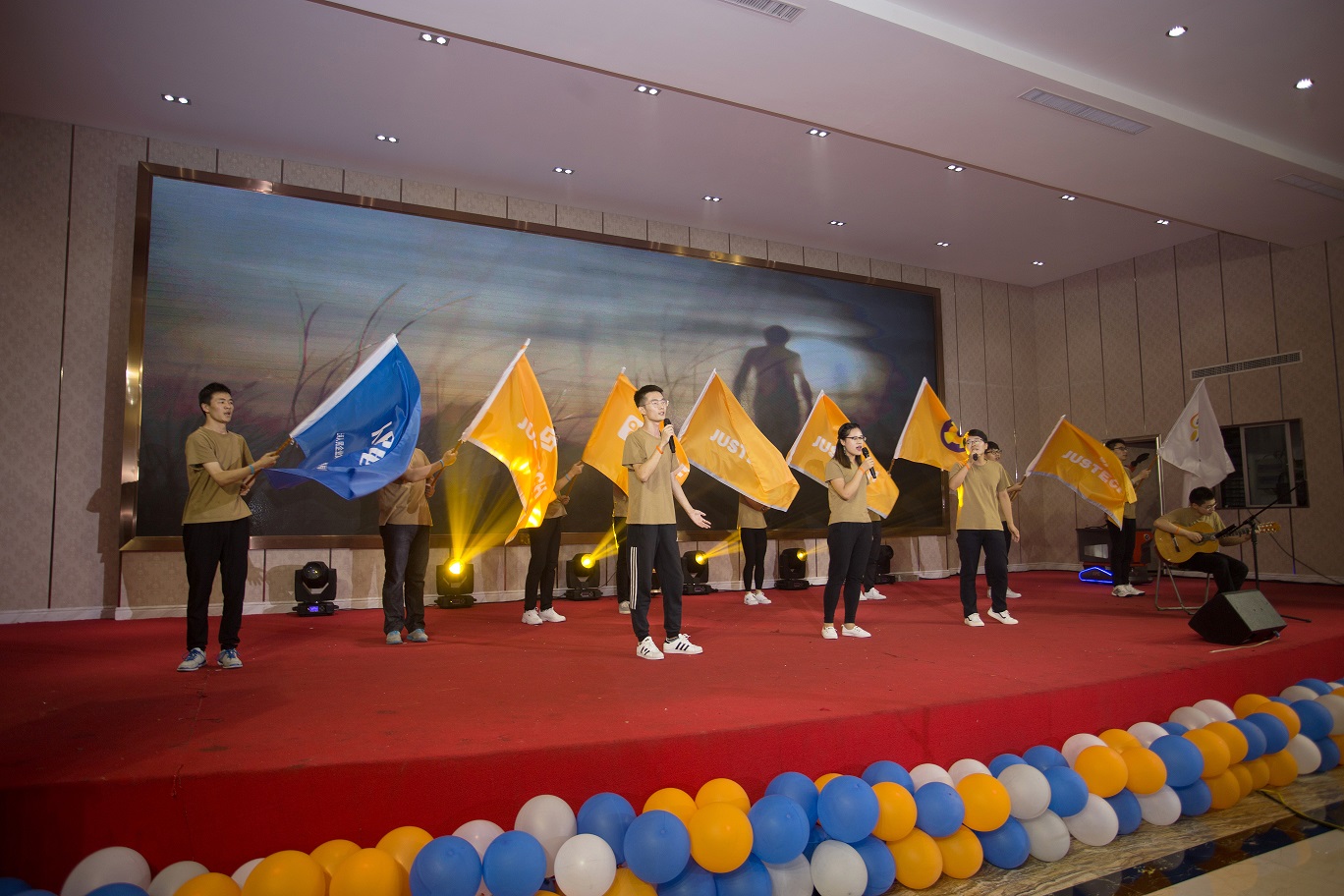 一首歌,现场共鸣欢声雷动,人浪中半路杀出8面旗帜,两路排开、八面威风,寓意杰士德集团旗下子公司披荆斩棘、旗开得胜。