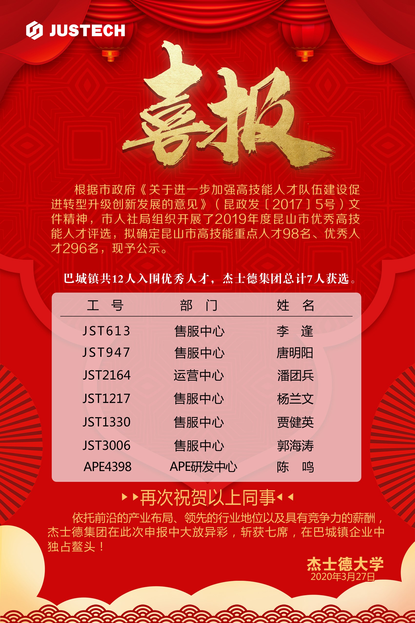 杰士德集团7名员工入选2019年昆山市高技能人才榜