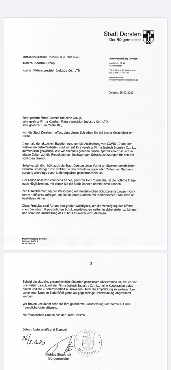 2020年3月26日,德国Dorsten市市长致信江苏杰士德集团旗下菲克驰精密制造有限公司总经理Frank,
