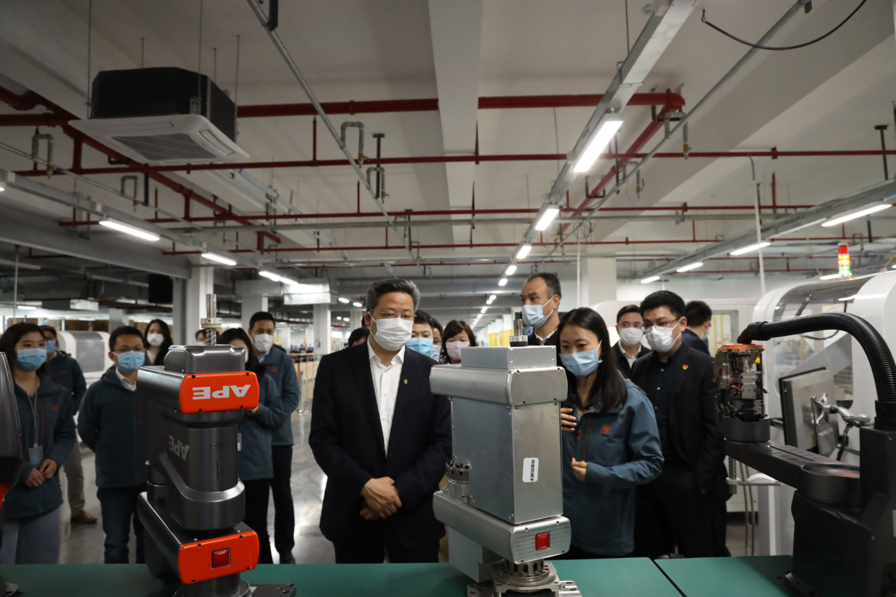 随后,吴书记一行深入园区昆山艾派科技机械生产车间,参观了工业机器人测试室、机构组装、AGV展示等生产现场。对企业用科技手段监测车间内的生产指标周趋势、工单完成率与异常关闭率的管理模式给予肯定。