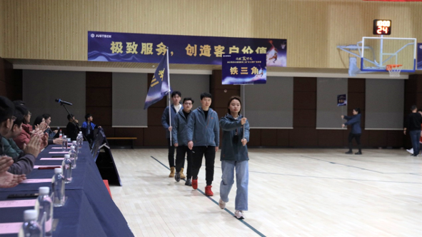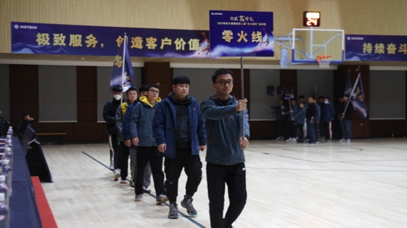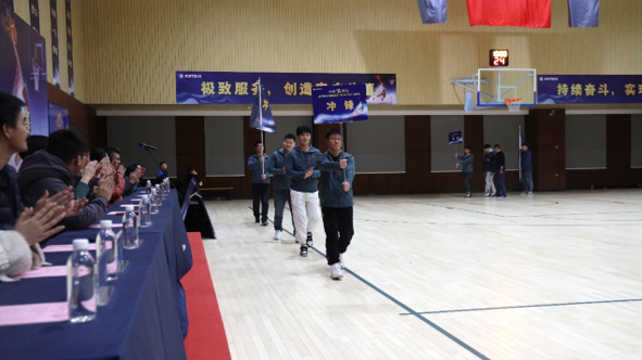 闭幕仪式上,伴随着欢快的《运动员进行曲》,在四名意气风发的旗手的护卫下,集团司旗庄重入场,随后,各参赛队迈着铿锵整齐的步伐,以昂扬的姿态步入场馆。