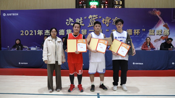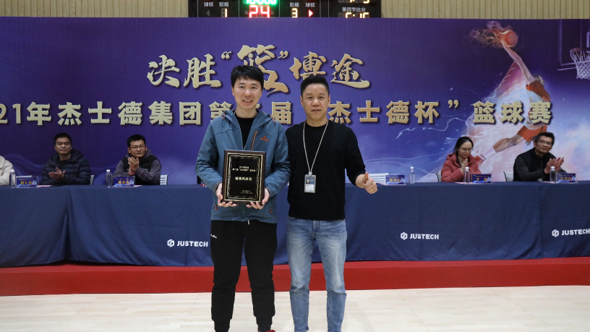 杰士德集团董事长特助、杰士德自动化项目管理中心副总经理、江南平台中心副总经理杨易乔为获得本次篮球赛季军队伍——螺丝钉队颁奖。
