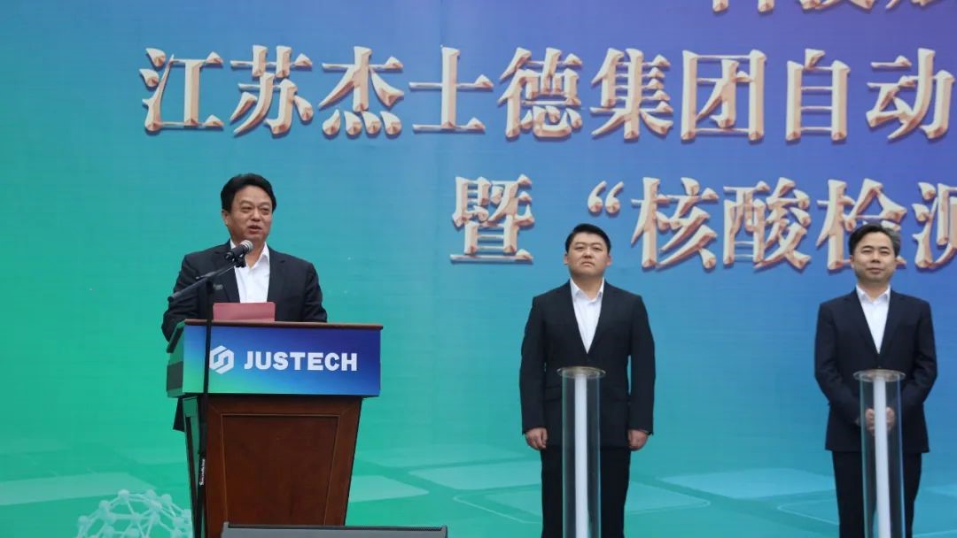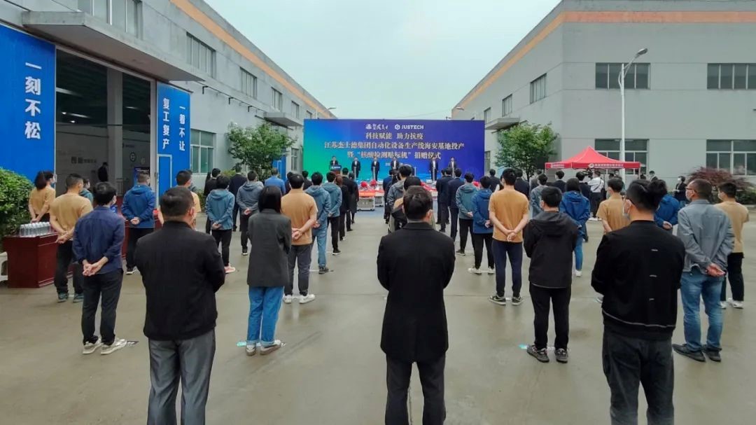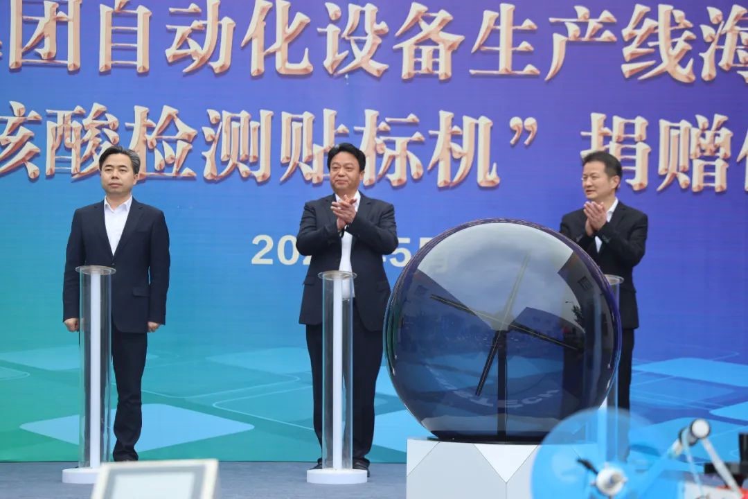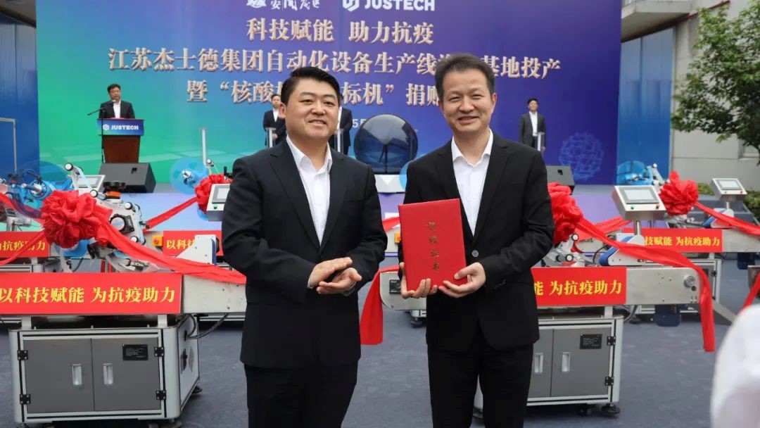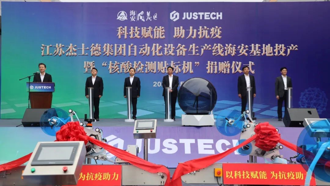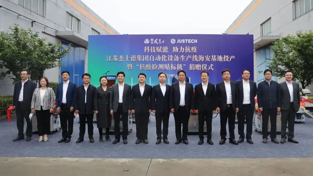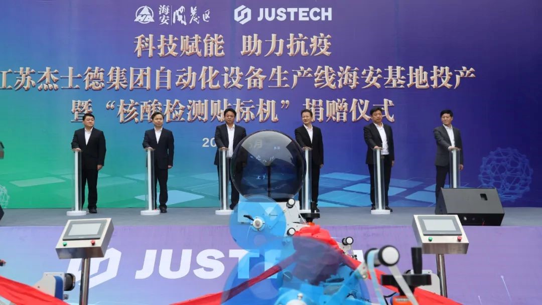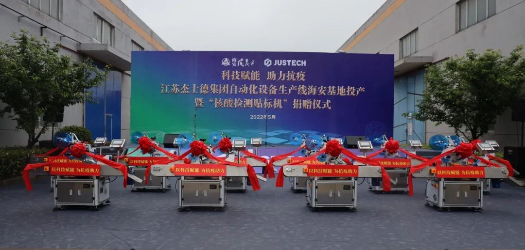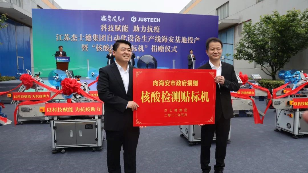 2022年5月13日上午8时30分,杰士德集团自动化设备生产线海安基地投产暨“核酸检测贴标机”捐赠仪式在海安隆重举行。