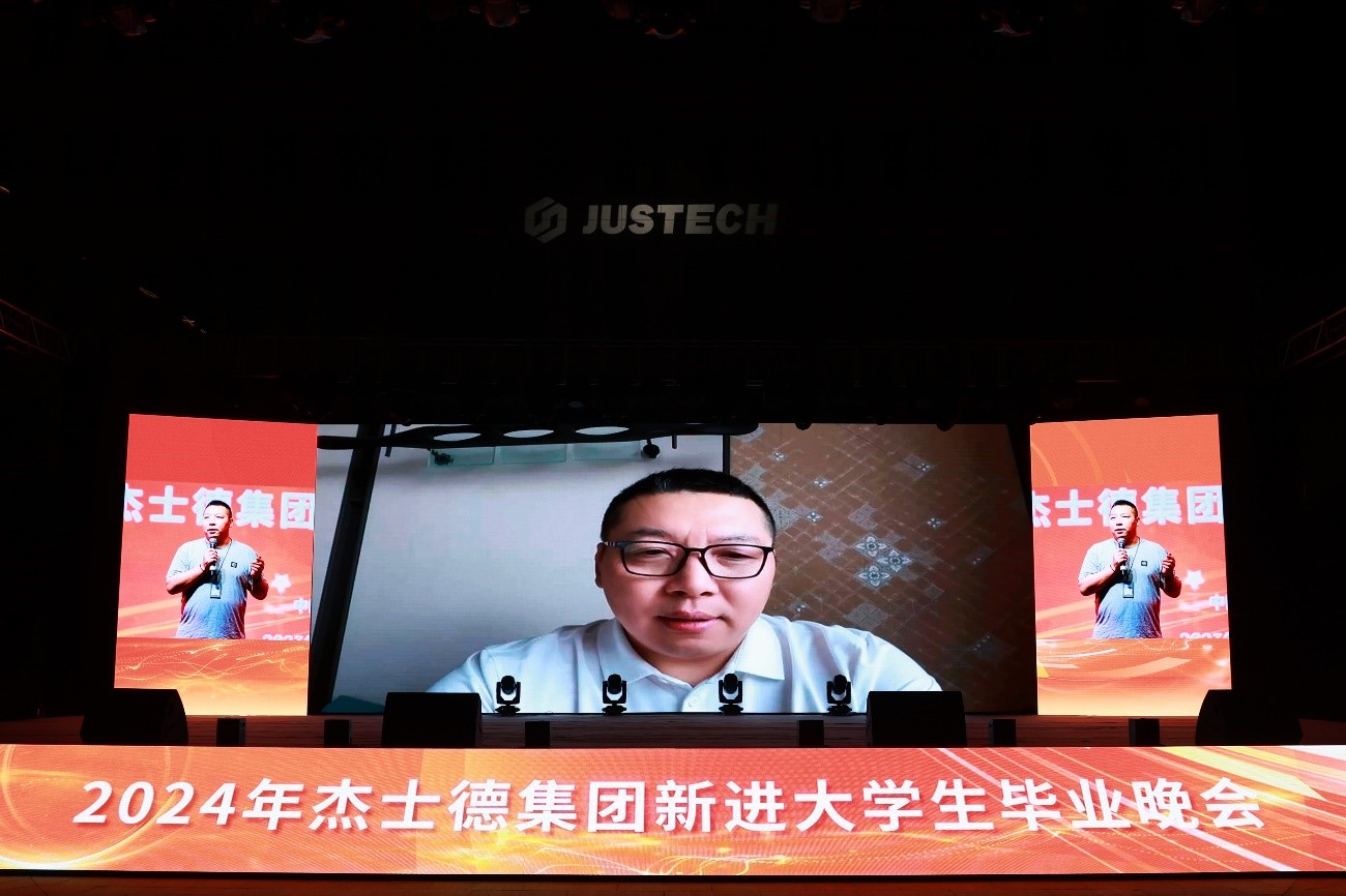 千里之外,真情尤浓!在毕业晚会伊始,因海外出差行程未能出席晚会的集团创始人、董事长、杰士德大学校长景余祥先生率先通过视频连线方式为第九届卓越班大学生们顺利结业送上祝福与期待。
