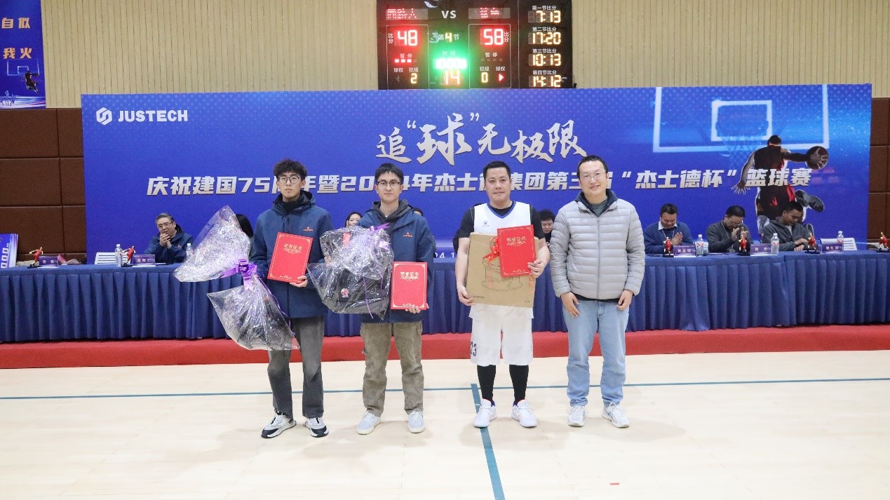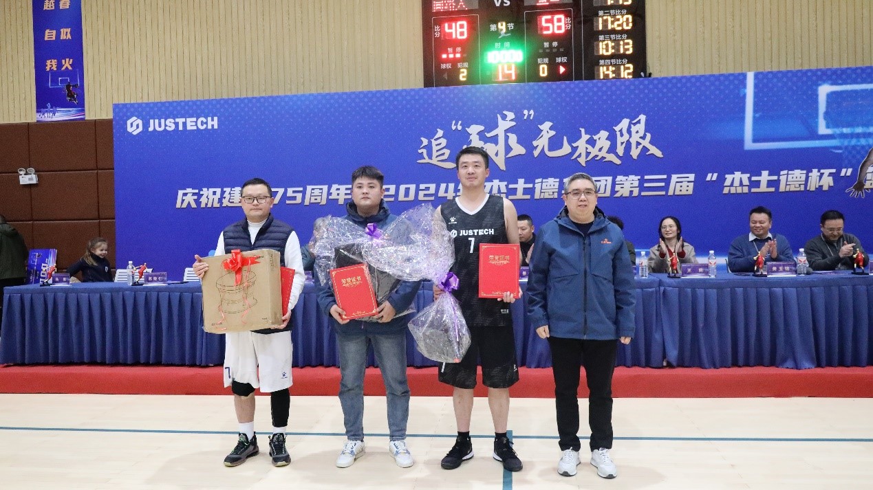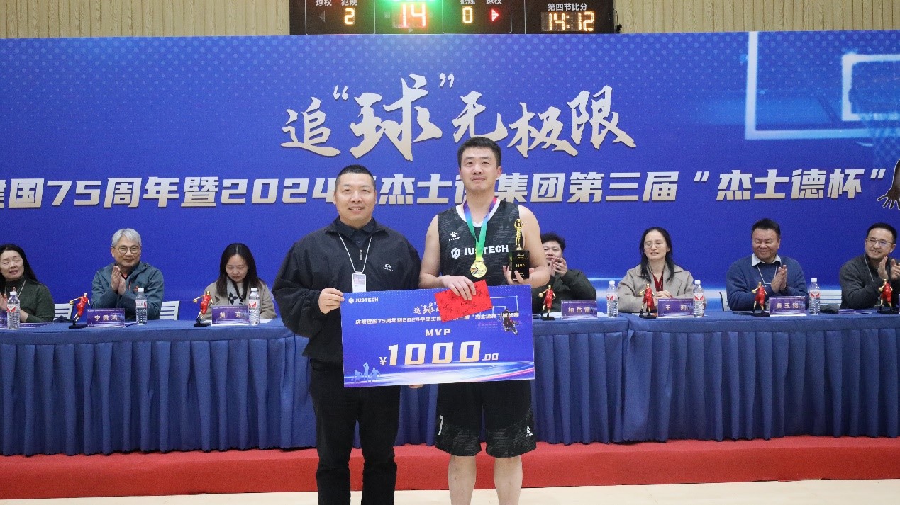 杰士德集团创始人、董事长、杰士德大学校长景余祥,集团董事长特助、杰士德大学常务副校长魏小俊为本次篮球赛一路过关斩将,获得冠军的鲨鱼队颁发奖杯、冠军旗及万元大奖。