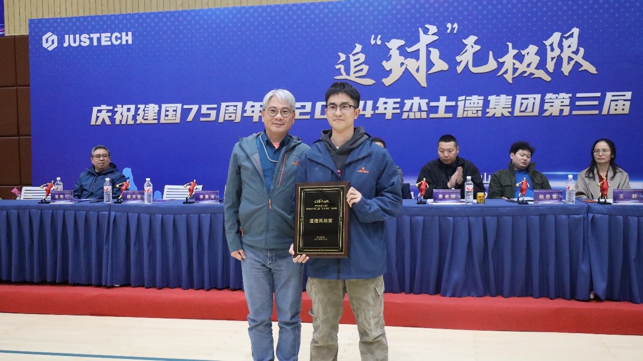 杰士德集团CRO、艾派科技总经理黄芳,杰士德自动化副总经理黄玉铭为获得本次篮球赛的季军队伍—螺丝钉队颁奖。