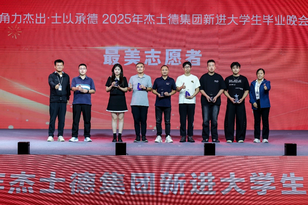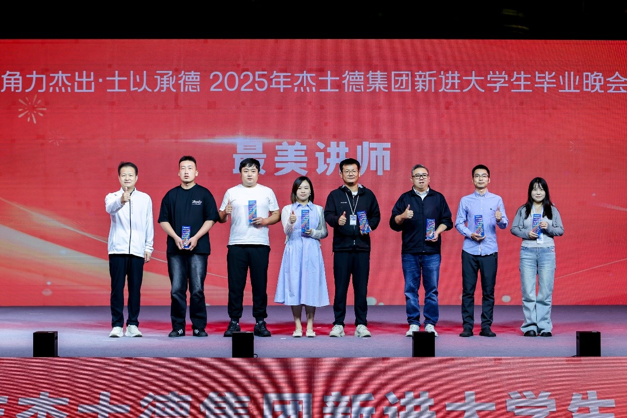 青蓝相接,薪火相传。为帮助新人快速融入杰士德大家庭,在本次卓越班训练营的培训组织与实施中,众多前辈及部门优秀讲师们踊跃协助与支持,保障了培训工作的圆满推进。在晚会上,集团为他们颁发了“最美讲师”、 “最美志愿者”奖项。同时,为彰显集团对人才培养的重视,践行“用最优秀的人培养更优秀的人”的人才培养理念,在绚烂的灯光和全场观众的注目下,2025年“好课好讲师大赛”决赛颁奖也在晚会上隆重举行,特邀嘉宾们为获奖讲师颁发了奖杯。