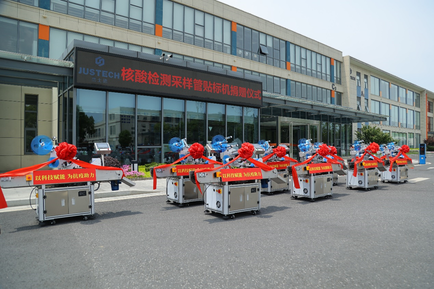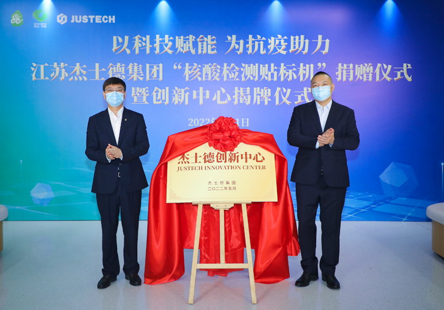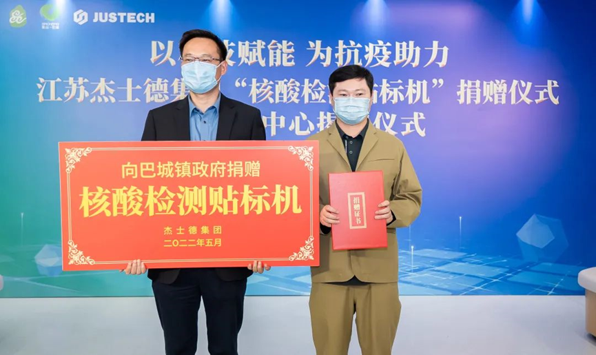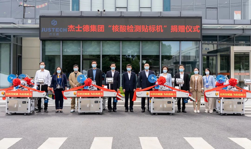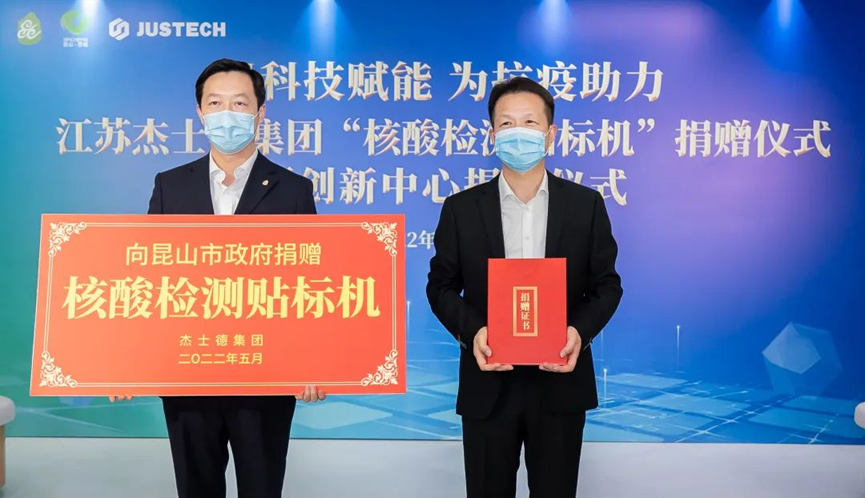 5月1日,杰士德集团“核酸检测贴标机”捐赠仪式暨集团创新中心揭牌仪式在集团昆山园区隆重举行,集团向昆山市和巴城镇捐赠价值近百万元的“核酸检测贴标机”,用以支持昆山疫情防控工作。