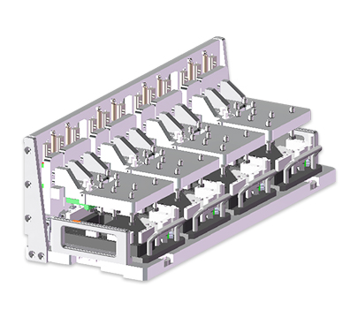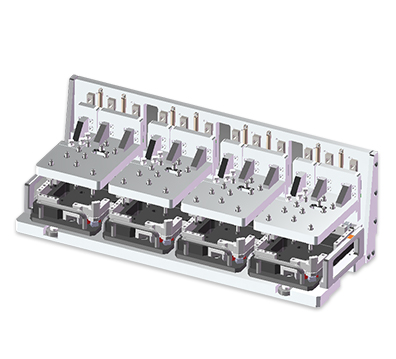 载具底座承载四个胶水尚未固化的产品,保压模块下压固定产品,随后载具流入高温固化炉完成胶水固化。