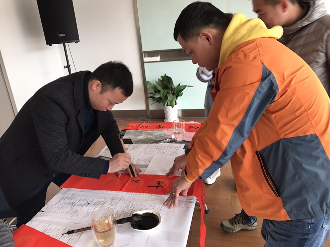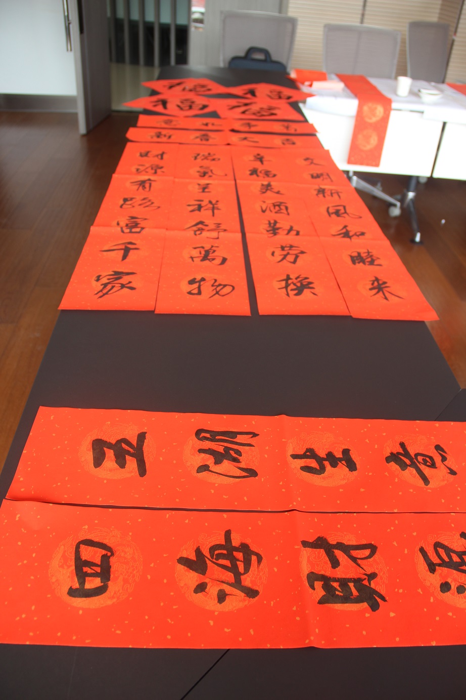“红联暖人心,墨香送祝福。”只见他们凝神聚气,笔走龙蛇,多种字体跃然纸上。不一会,一幅幅散发着墨香与年味的大红对联与“福”字就展现在大家面前。围观的员工纷纷赞叹不已。更有不少员工围在书法家旁边,定制属于自己的春联,场面十分热闹。