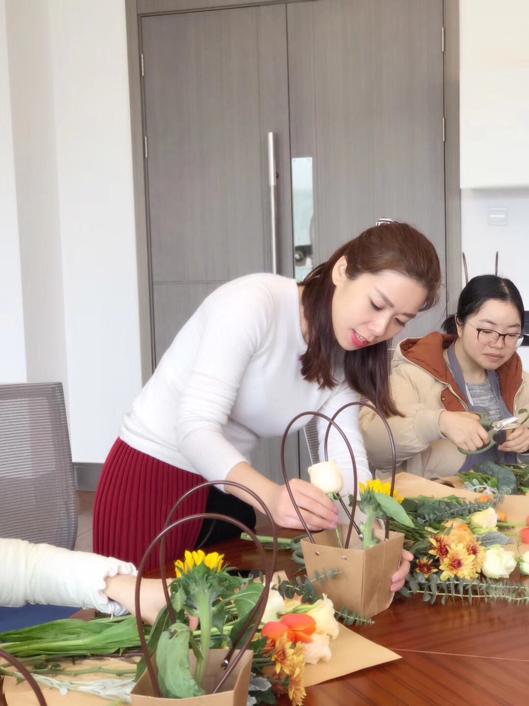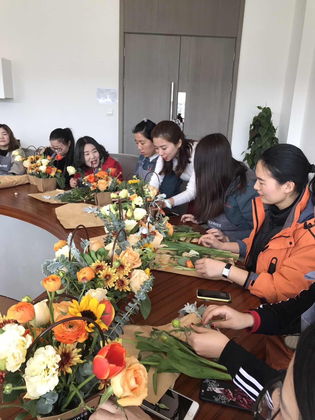 在老师的倾心指导下,童鞋们兴致勃勃地开始了插花实践。修剪花枝、整理花朵、讨论插花位置和技艺,还不时观摩其他员工的作品,或向老师求教,兴致盎然。一时间,鲜花丽人,交相辉映,美不胜收!
