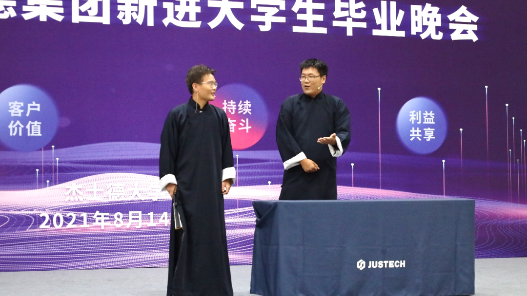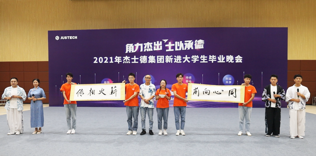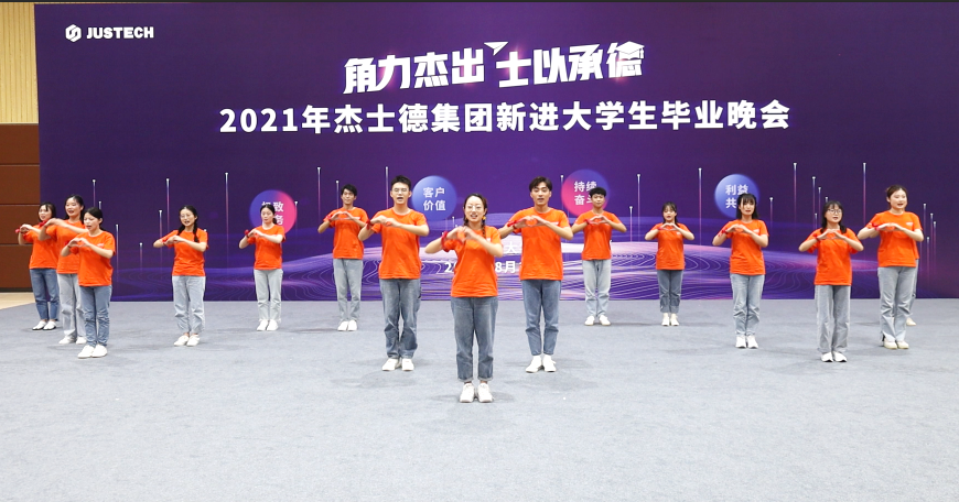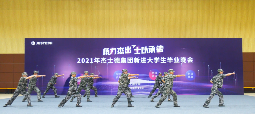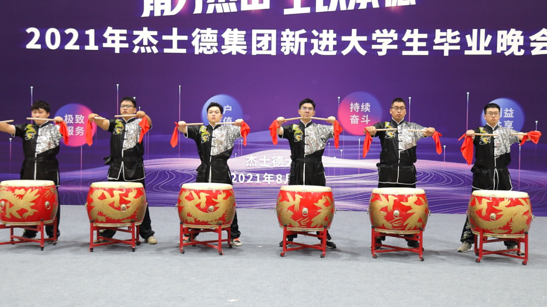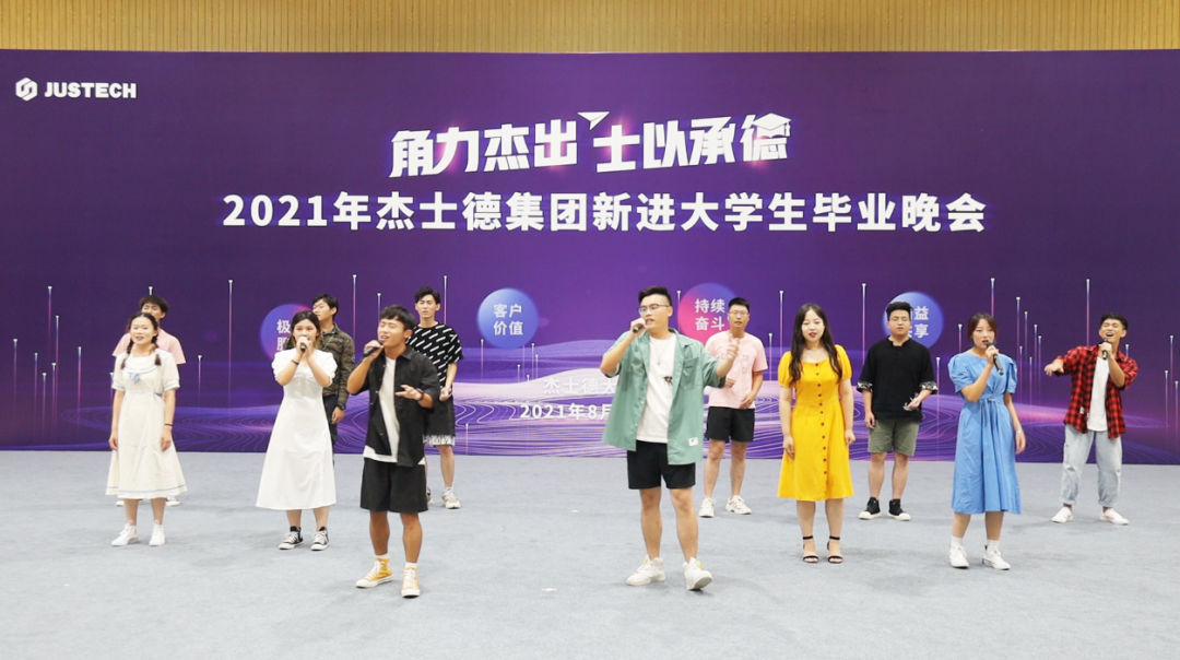 征程是面对未来的勇气,汇演以气势恢宏、鼓声震天、正气浩然的鼓舞节目《燃》拉开帷幕;一首荡气回肠、婉转悠长的《万疆》搭配葛小勇老师苍劲有力的书法表演,将杰士德人同心向前,薪火相传的精神表现得淋漓尽致;铿锵有力的军体拳全方位展示了新进大学生们在烈日下所取得的进步与蜕变;相声表演《爱在杰士德》以幽默、风趣的形式展现了他们这一个月里的用心观察,细心体会,体现了大学生们对杰士德文化的高度认同;激荡人心的歌曲串烧将现场氛围推向高潮,展现了杰士德集团蓬勃的朝气和高昂的拼搏劲头;以平行时空,新老员工隔空对话形式的朗诵,展现了杰士德文化的传承与帮带;情景剧《城北西路的日子》以剧中剧的方式,讲述不同性格、不同背景的年轻人,在杰士德相互包容、快速成长、满怀热血、拥抱未来的故事;舞蹈串烧充分展现了杰士德新员工的青春活力、多才多艺;第五届卓越班袁凡学姐现场演唱了原创歌曲《JUSTECH》,在动感而动听的旋律中,感受到杰士德的文化正以全新的形式传播、流淌;大学生们以动作整齐、饱含深情的手语舞《听我说谢谢你》表达了对培训期间所有的老师的感恩之情;整场汇演在全体演职人员共同唱响的杰士德集团司歌——《在你身旁》中落下帷幕。