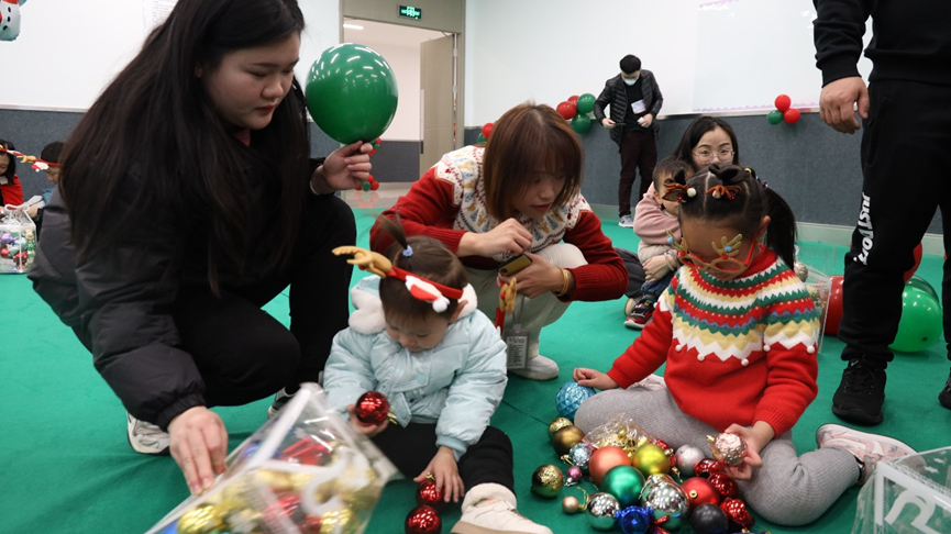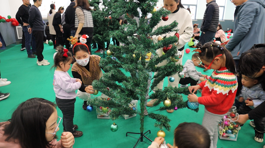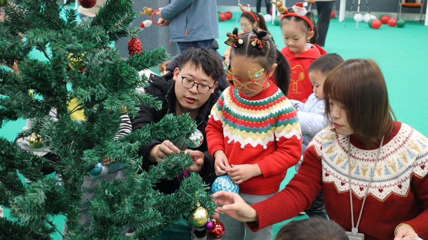 装饰圣诞树成为了上午活动的重头戏,青绿的圣诞树上,被小朋友和家长们亲手悬挂上松果、彩球、蝴蝶结、礼物,彩灯,精心的装饰让圣诞树光彩夺目,大家围坐一圈,共享这瞬时美好。