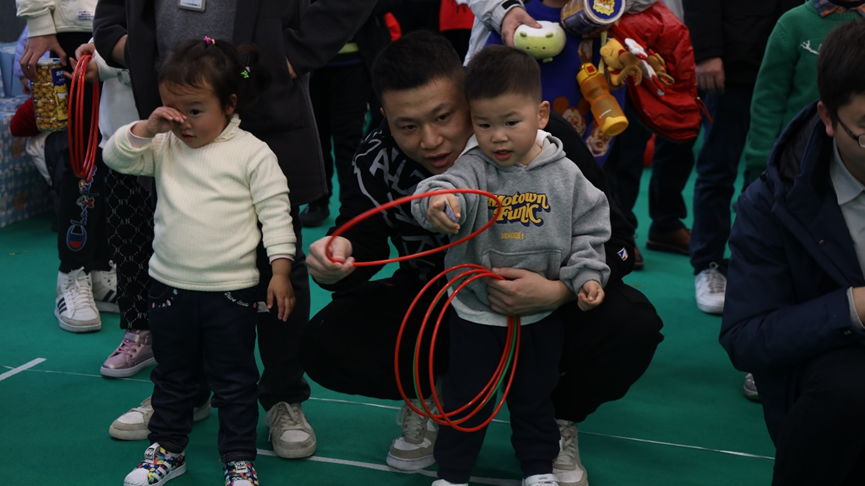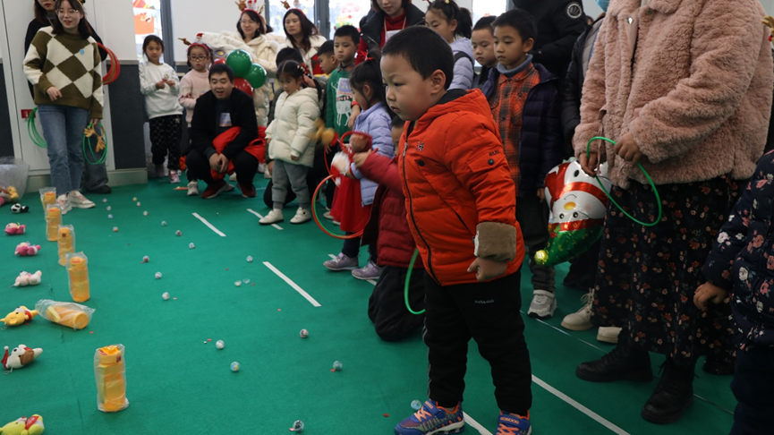 观影在圣诞的感动中结束,一轮礼品大放送的套圈环节随之展开,吸引小朋友们眼球的小礼物小玩具整齐地排列在游戏区,套到的礼品可以直接带走,小朋友们兴趣斐然,家长们也跃跃欲试。